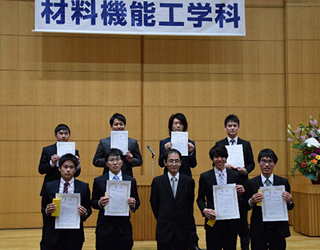 祝辞の後、学科長から学位記が卒業生全員に手渡されました。次に、材料会から、卒業論文および修士論文の発表会で優秀賞を受賞された方々に、お祝いとして表彰状と記念品をお渡しました。
